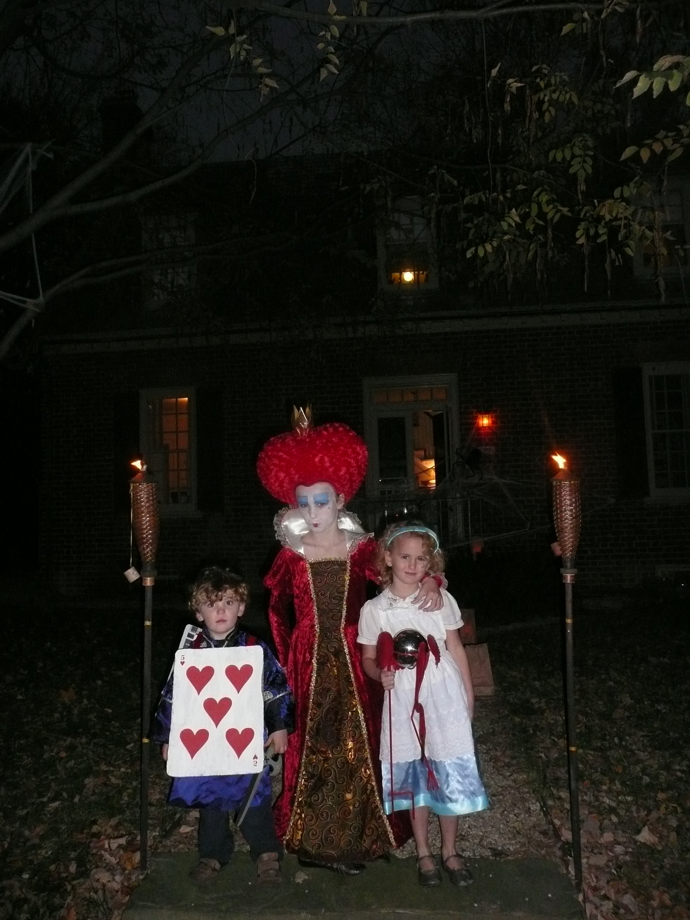 I had already prepared the girls for the possibility that their flamingo legs might come off which I knew could result in serious drama on the part of my 3rd grade Red Queen and a general melt down on the part of Alice. We had agreed over hasty English Muffins (we don’t call them that in England) that flamingos often stand on one leg so it would not be serious were we to lose a limb, but what do the bloody things decide to do? Half way to school, they drop the supporting leg. We all agree that this does not look realistic. We return home tugging Puffy who is still demanding to meet Halloween and threatening to get another attack of HipCups. Several swathes of postage tape later they are trussed and bound and look as though they saw the wrong end of the Red Queen’s