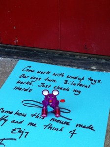 Later that day I found myself in a lovely independent toy shop (not politically independent although they are almost certainly all tofu loving monkey huggers) playing with a colourful variety of wind up toys. I realized there is nothing more cheering than a wind up toy: crabs sidling along with a waving claw, red ladybugs (US English) /Ladybirds (UK English) with ambling black legs and antennae, and a particularly positive blue mouse with a hunk of purple cheese doing backward flips. I left one on the doorstep of Ms 55 billion advocating a new career in clockwork toys where cogs turn and bilateral has to work or nothing moves forwards or flips or waves a claw.